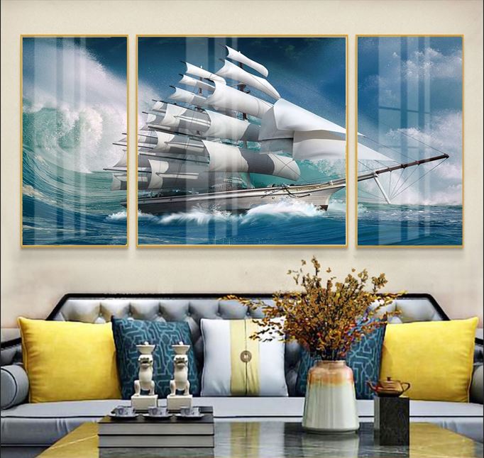 Tranh tráng gương Thuận buồm xuôi gió 70 là một trong những mẫu tranh phong cảnh treo phòng khách đẹp. Đây cũng là dòng tranh phong thủy mang nhiều ý nghĩa tốt lành. Bộ tranh gồm 3 tấm ghép mảnh tạo sự mềm mại và uyển chuyển cho không gian treo