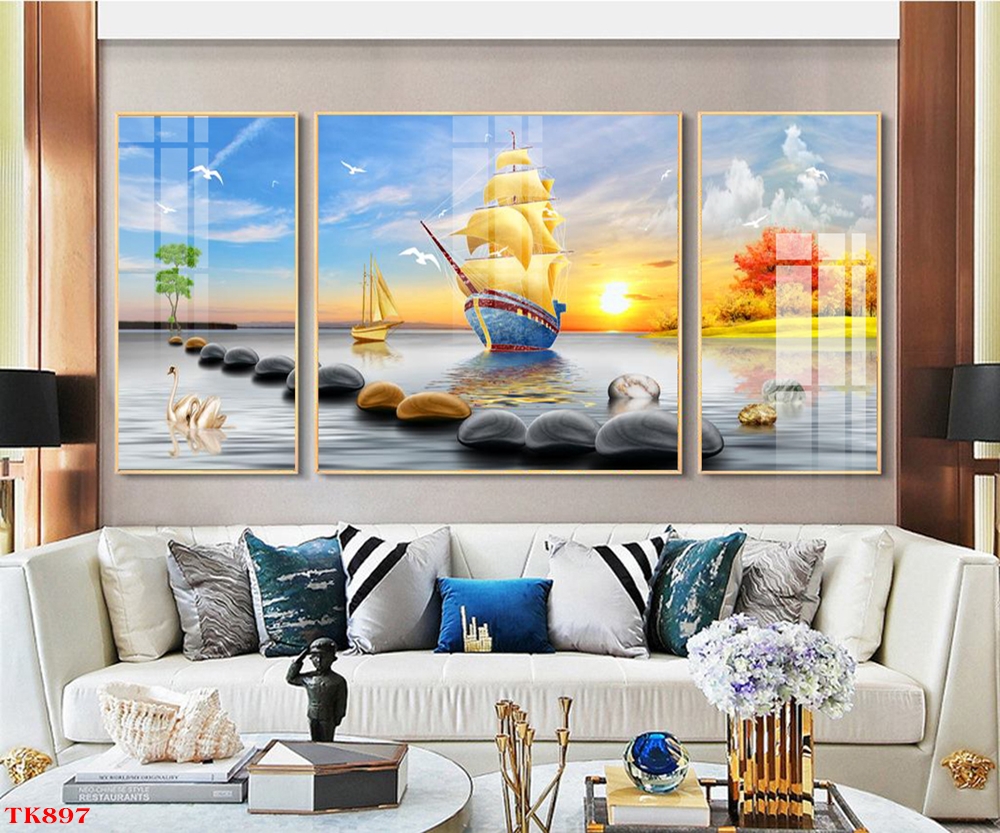 Bộ sản phẩm: gồm 03 tranh theo kích thước và mô tả như trên cùng phụ kiện đi kèm (đinh treo 3 chân hoặc đinh sắt, vít nở...).